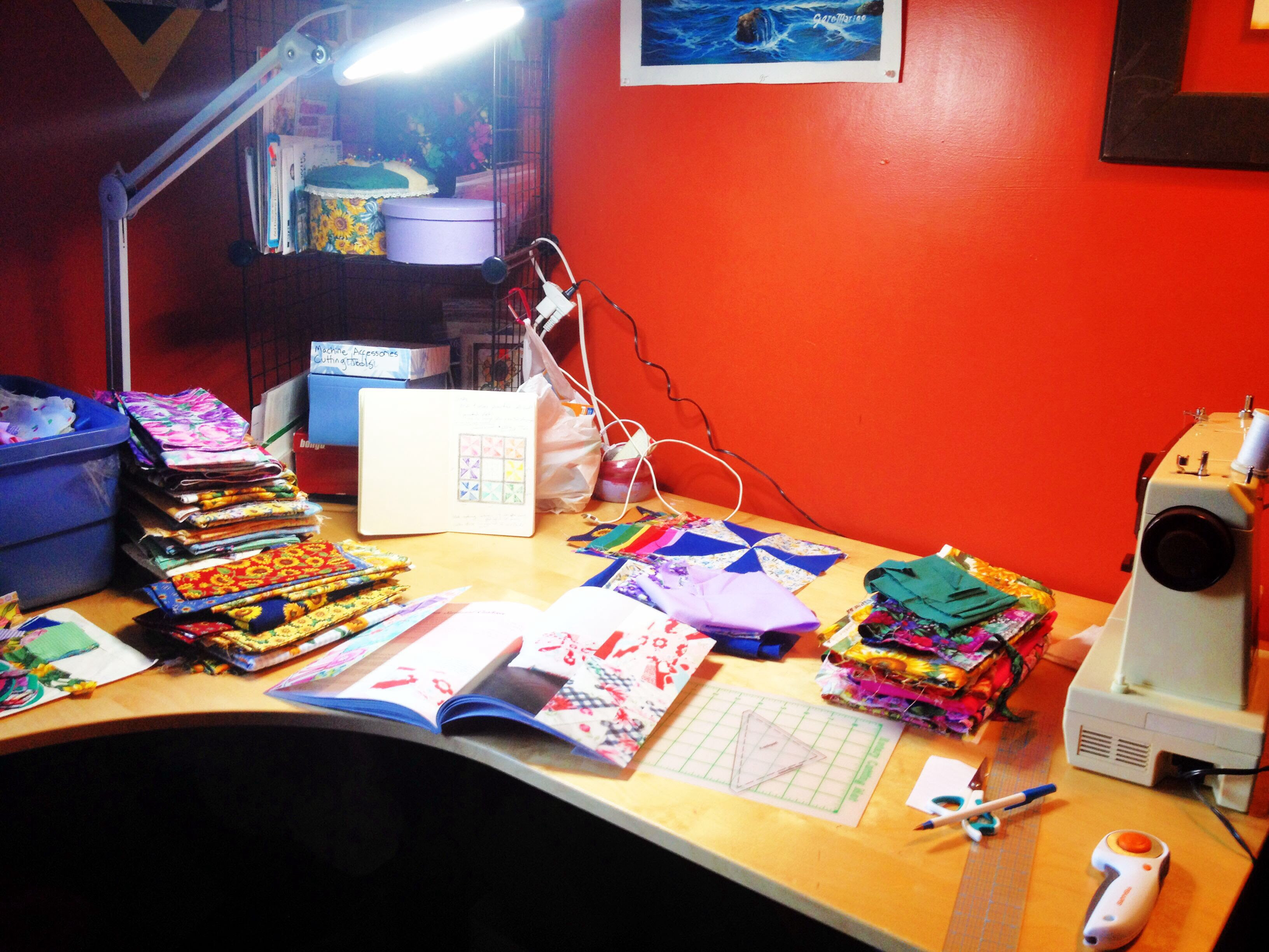 One thing I want to say about using MSQCO's method for making half square triangles: all your edges become bias edges. Take special care to not stretch or tug your fabric as it goes through the machine. I tend to be a little lax on such things and my final blocks were all slightly wonky as a result. I'll probably use this technique again but I'll be much more careful about the bias stretching.